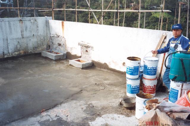 水滲入這棟私人住宅屋頂下的房間。為此,施工人員拆除老式混凝土封頂,採用賽柏斯修補堵漏劑和防水濃縮劑修補裂痕。然後用兩層賽柏斯濃縮劑對整個表面進行處理。最後澆築 5 cm 厚的封頂,並在頂部貼上瓷磚。從而成功封堵了所有滲漏。